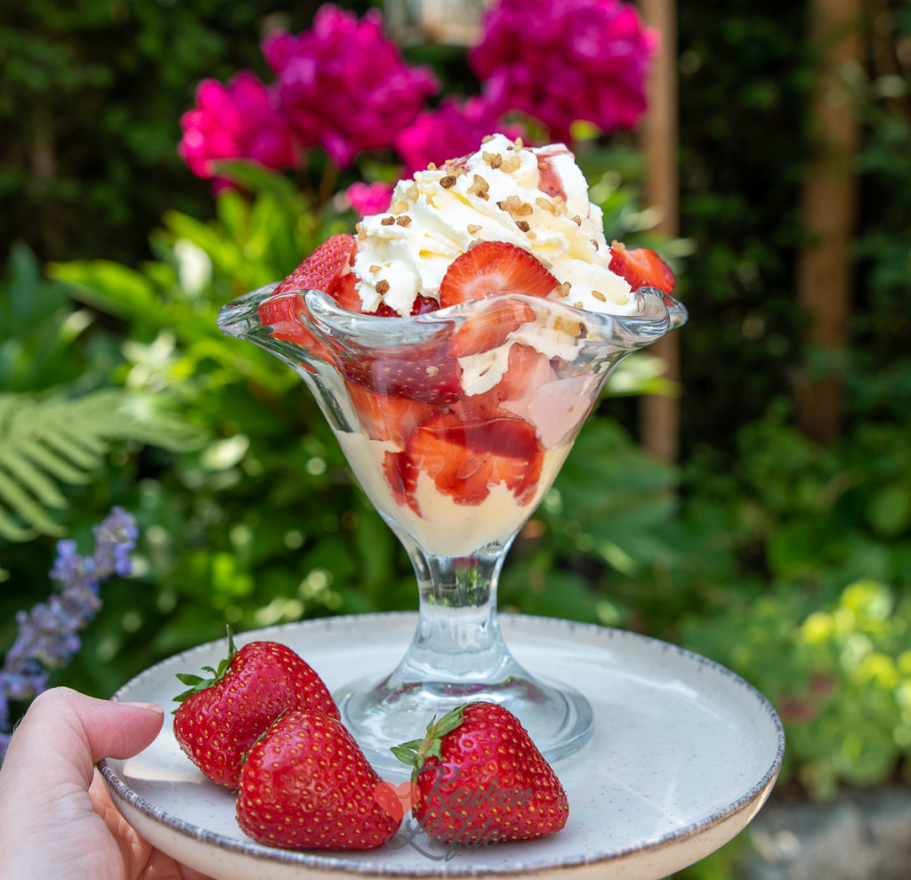 Aardbeien coupe. Een heerlijk dessert op een warme zomerdag. Deze aardbeien coupe is gevuld met romig vanille- en aardbeienijs, friszoete (Hollandse!) aardbeien, aardbeiensaus en slagroom. Je maakt het af met een wafeltje (die ik had klaarliggen maar vergat) en krokante nogatine. Gemaakt in 5 minuten tijd en op en top verwennerij!