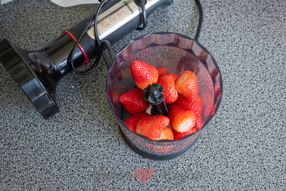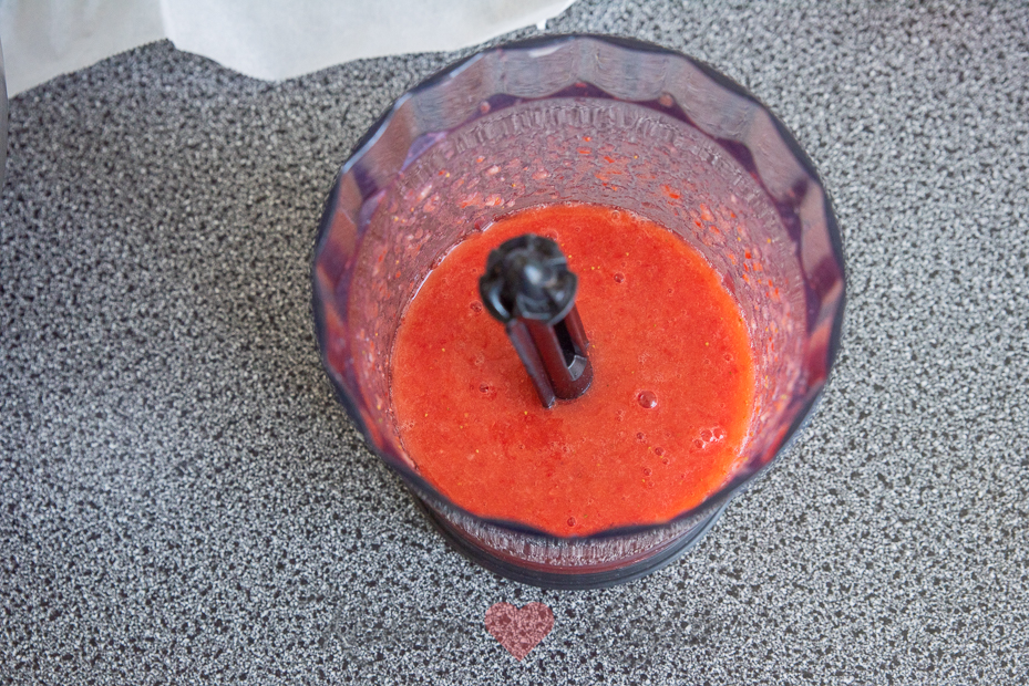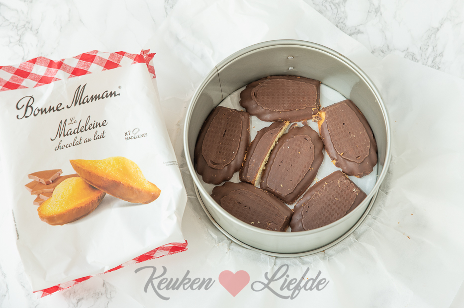 Snijd de madeleines overlangs doormidden, je hebt nu een chocoladedeel en een bol deel zonder chocolade. Bedek de bodem met de chocolade madeleines, de chocoladekant naarboven. Bewaar het bolle deel van de madeleines voor garnering. Was de aardbeien met de kroontjes en laat uitlekken. Verwijder de kroontjes en pureer 250 gram aardbeien in de keukenmachine tot een gladde puree.