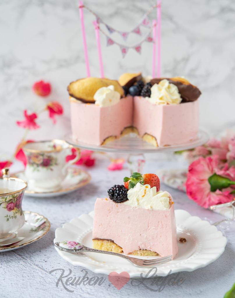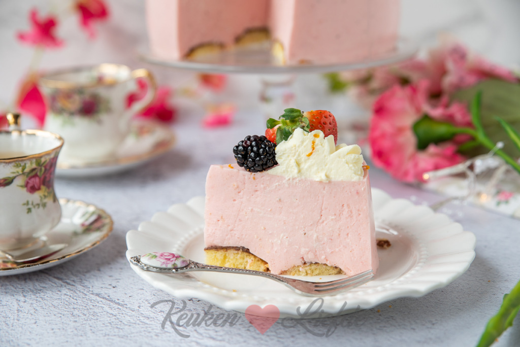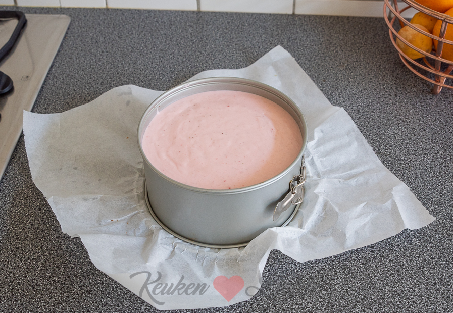 Pers de sinaasappel uit en verwarm het sap — niet laten koken, alleen verwarmen. Zet het vuur uit en los de gelatine op in de sinaasappelsap. Klop de slagroom stijf met de helft van de suiker. Klop in een andere kom de kwark, overige suiker en aardbeienpuree door elkaar. Roer het sinaasappelsap door het kwarkmengsel. Spatel in meerdere stappen het kwarkmengsel door de slagroom. Als je wilt kun je nu ook de rode levensmiddelenkleurstof door de kwarkvulling roeren, om hem een intensere kleur te geven. Schenk het kwarkmengsel over de bodem en strijk de bovenkant glad. Dek de vorm af met een bord of folie en zet een nacht in de koelkast om op te stijven.