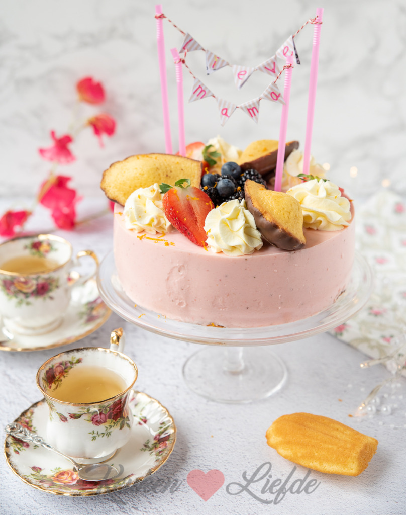 Zet de vlaggetjeslijn bovenop de taart. Klop de slagroom stijf met de vanillesuiker en doe in een spuitzak met stervormige spuitmond. Garneer de taart vlak voor serveren met toeven slagroom, gehalveerde aardbeien (laat het kroontje zitten, dat ziet er leuk uit), bramen en blauwe bessen en chocolade madeleines. Rasp tot slot wat sinaasappelschil over de taart.