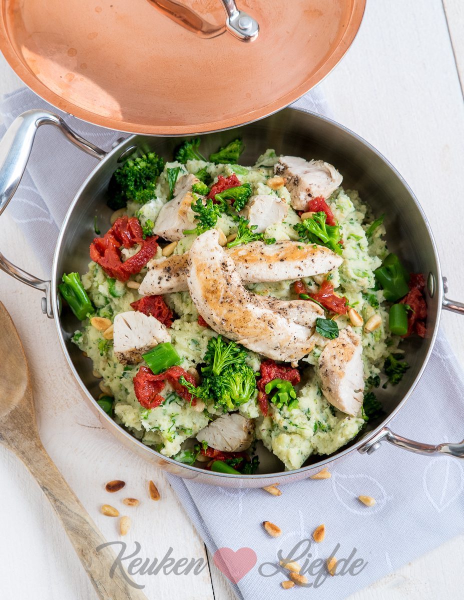 aspergebroccolistamppot met pesto en kipfilethaasjes