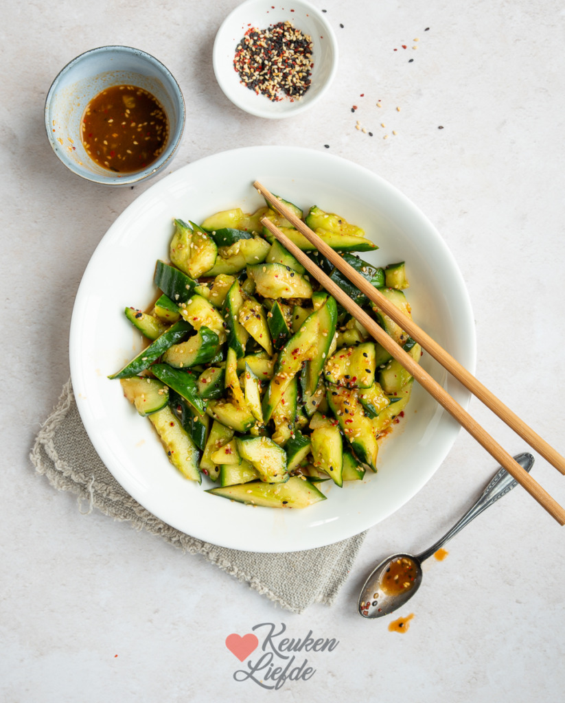Aziatische komkommersalade. Deze frisse komkommersalade is aangemaakt met een Aziatische dressing met onder andere gochujang, gochugaru en sojasaus. Heerlijk om te serveren bij een bordje noedels, of als bijgerecht bij een (Aziatische) maaltijd.