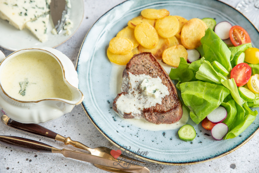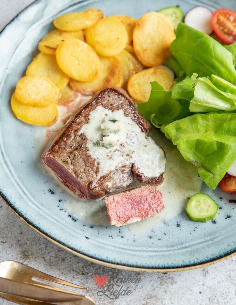 Een makkelijk recept voor malse biefstuk met roquefortsaus, gebakken aardappels en salade. Een echt verwengerecht dat ik graag in het weekend of tijdens de feestdagen op tafel zet. Biefstuk is vrij kostbaar maar je kunt hem in dit recept ook vervangen door entrecote, varkenshaas of kipfilet. Zo kun je dit gerecht ook prima doordeweeks op tafel zetten.