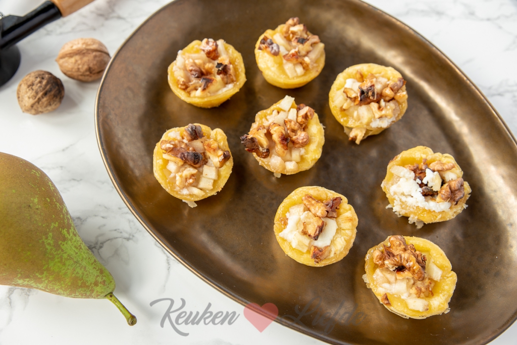 Vul de bladerdeegholtes met een stukje geitenkaas, wat blokjes peer, walnoot en druppel er wat honing overheen.