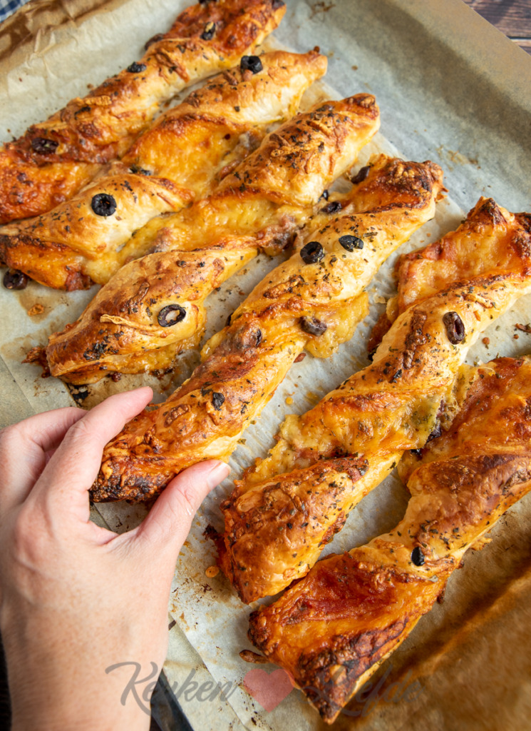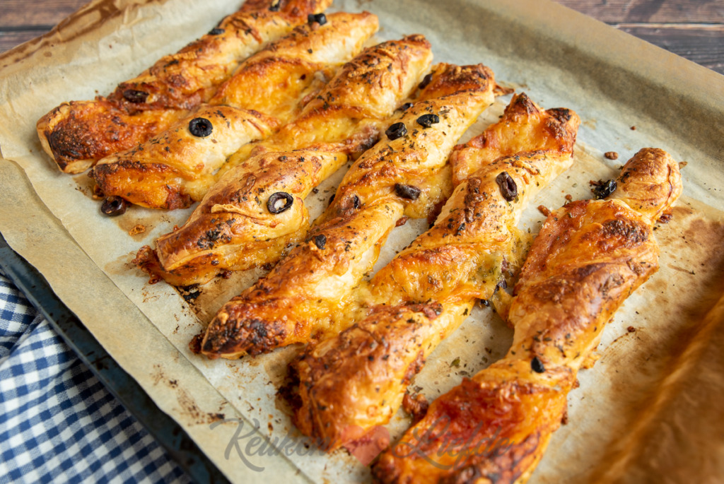 Ben jij ook zo dol op kaasstengels? Je maakt ze heel makkelijk zelf. Een lekkere variant zijn deze pizza stengels met tomatensaus, salami, kaas en olijven. Heerlijk als tussendoor snack, maar ook lekker bij een kop (tomaten)soep. Lauwwarm zijn ze het allerlekkerst. Wil je ze maken om later te eten? Piep ze dan van tevoren kort op in de oven, dan smaken ze weer als vers.