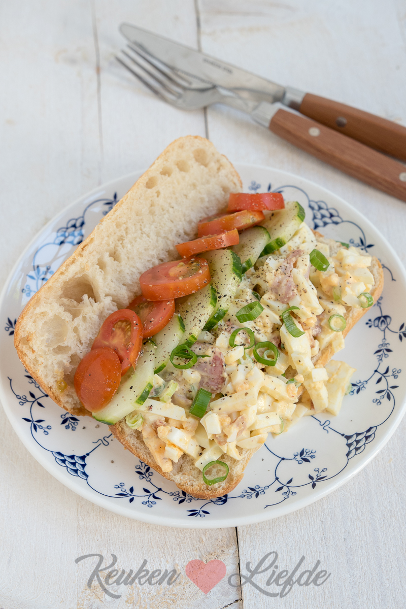 De eiersalade maak ik deels aan met mayonaise en deels met yoghurt. Zo wordt de eiersalade wat lichter en frisser van smaak dan een variant met mayonaise.