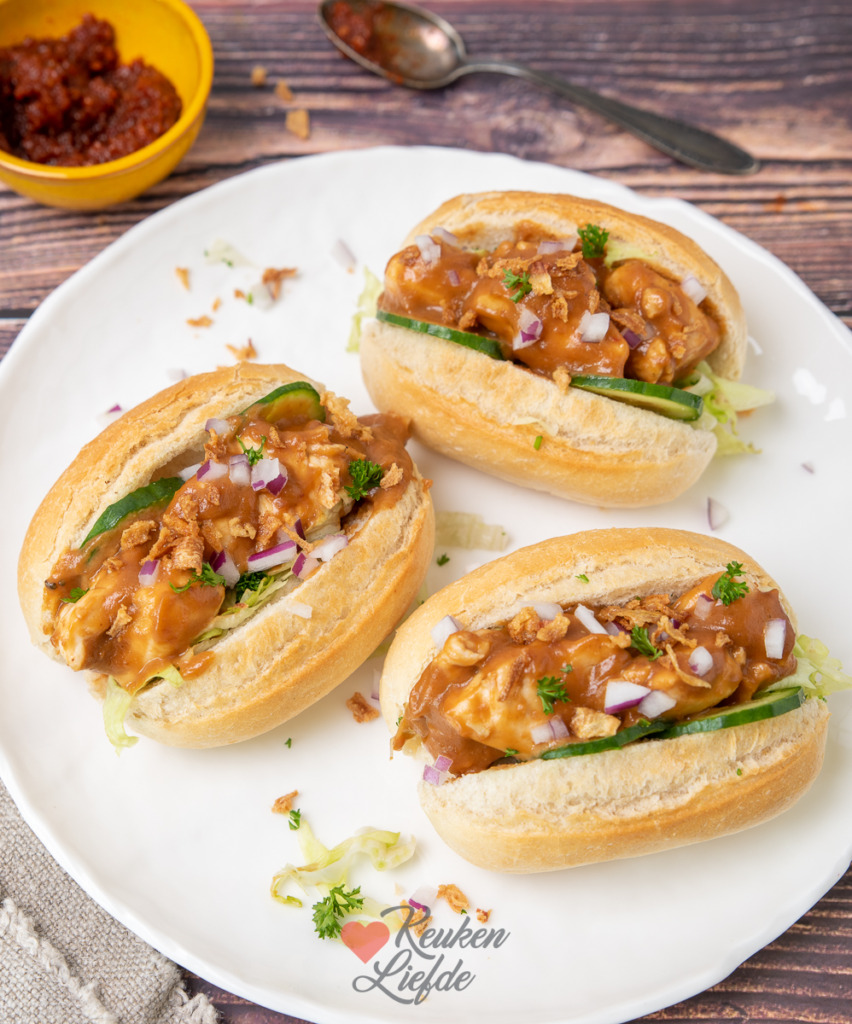 Dit broodje kipsaté is belegd met malse stukjes kip in satésaus, frisse komkommer en ijsbergsla. Lekker als lunch, of serveer als lichte avondmaaltijd. Serveer in dat geval twee broodjes per persoon, eventueel met een kommetje kippensoep erbij.