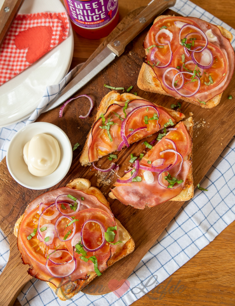 Is het al lunchtijd? Deze broodsnacks uit de oven zijn zo gemaakt en je kunt er eindeloos mee variëren. De combinatie van pittige sambal, ham en kaas, tomaat en ui die ik hier gebruik is heerlijk, maar je kunt ook andere ingrediënten uit je koelkast gebruiken. Zo zijn reepjes paprika en plakjes champignon ook lekker, of vervang de ham eens door salami. Je kunt deze broodsnacks ook als hapje serveren, snijd ze dan diagonaal doormidden of in vieren. Lekker met een drizzle van zoete chilisaus.