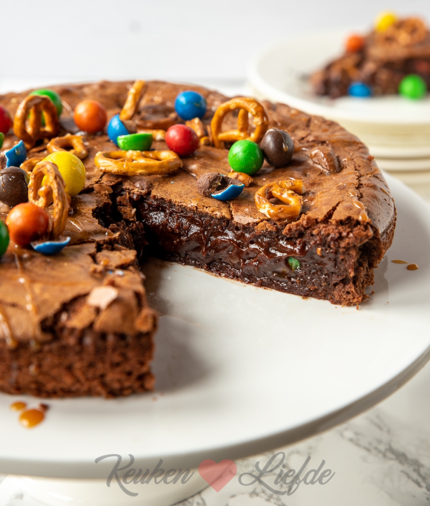Zet de springvorm op een rooster en laat iets afkoelen. Verwijder de springvorm en garneer de brownietaart met de achtergehouden M&M’s, pretzels en drizzle er wat karamelsaus overheen. Snijd in kleine puntjes (hij is erg machtig!) en serveer.