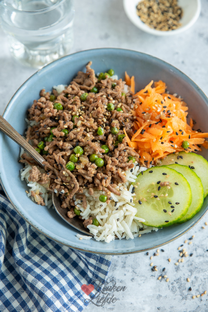 Dit gerecht is ideaal om te maken als je weinig tijd hebt om te koken en toch iets lekkers wilt eten. Het gehakt wordt eerst rul en goudbruin gebakken in de wok en daarna voeg je de zelfgemaakte woksaus toe. De doperwtjes geven kleur aan het gerecht en een lekkere bite.