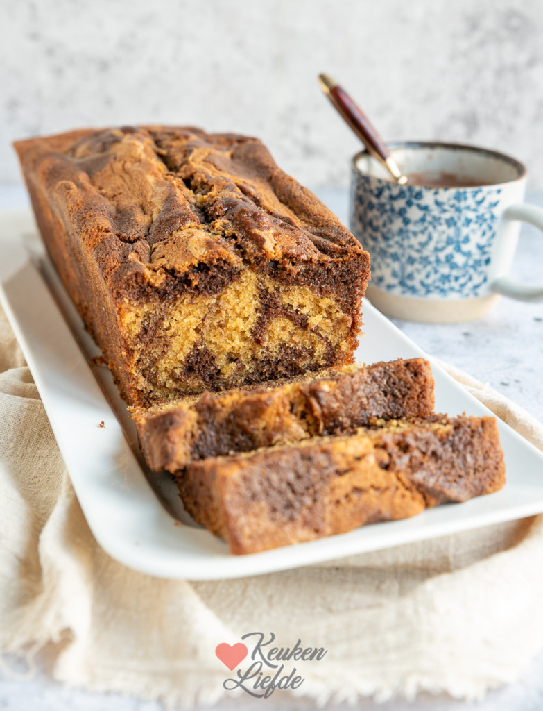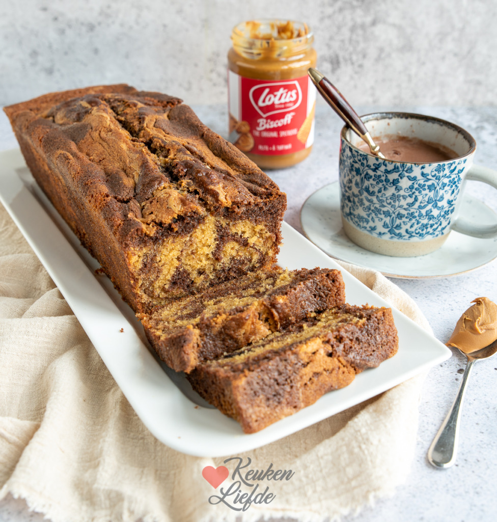 Na het maken van het basis cakebeslag verdeel ik het beslag in tweeën. Door de ene helft meng ik cacaopoeder en door de andere helft speculoospasta. Vervolgens verdeel je de twee soorten beslag om en om in het cakeblik en swirl je ze door elkaar. Een kleine aanpassing met heerlijk resultaat!