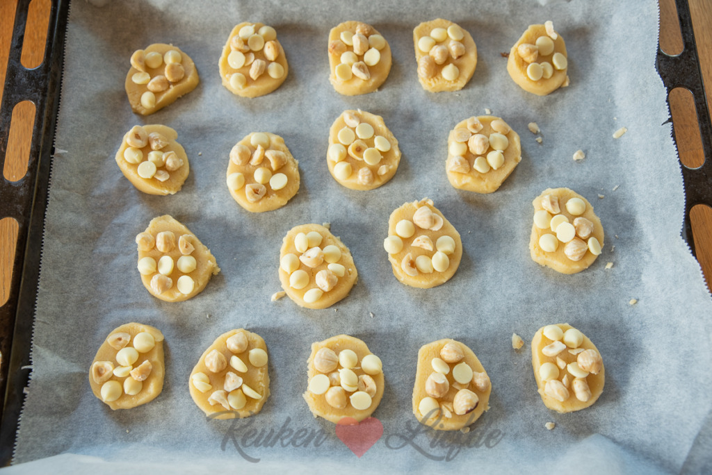 Snijd de rol in plakken en leg ze met wat ruimte ertussen op het bakblik. Verdeel de witte chocoladedruppels en hazelnoten over de koekjes en druk licht aan.
