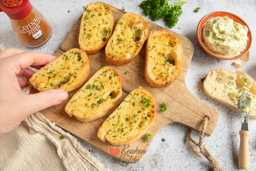 Door de knoflooktenen voor de knoflookboter vooraf te poffen in de oven verdwijnt de scherpe knoflooksmaak en worden ze zoet van smaak. Je kunt de knoflookbroodjes van tevoren al maken en bewaren in de koelkast. Voor gebruik warm je ze afgedekt met een vel aluminiumfolie weer even op in een voorverwarmde oven.