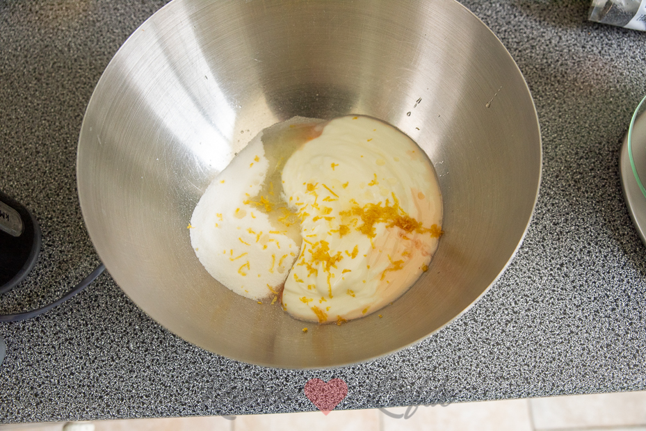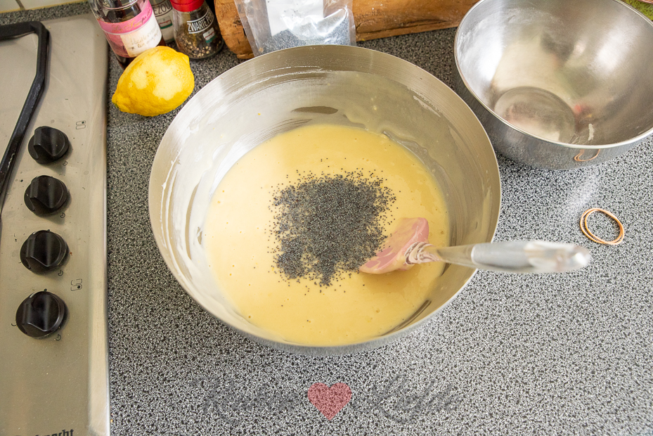 Klop in een ruime kom de beide soorten suiker en yoghurt door elkaar. Voeg de zonnebloemolie toe en klop verder tot de olie is opgenomen. Voeg al kloppend een voor een de eieren toe, voeg steeds pas het volgende ei toe als de vorige is opgenomen. Spatel de citroenrasp, het -sap en maanzaad door het beslag.