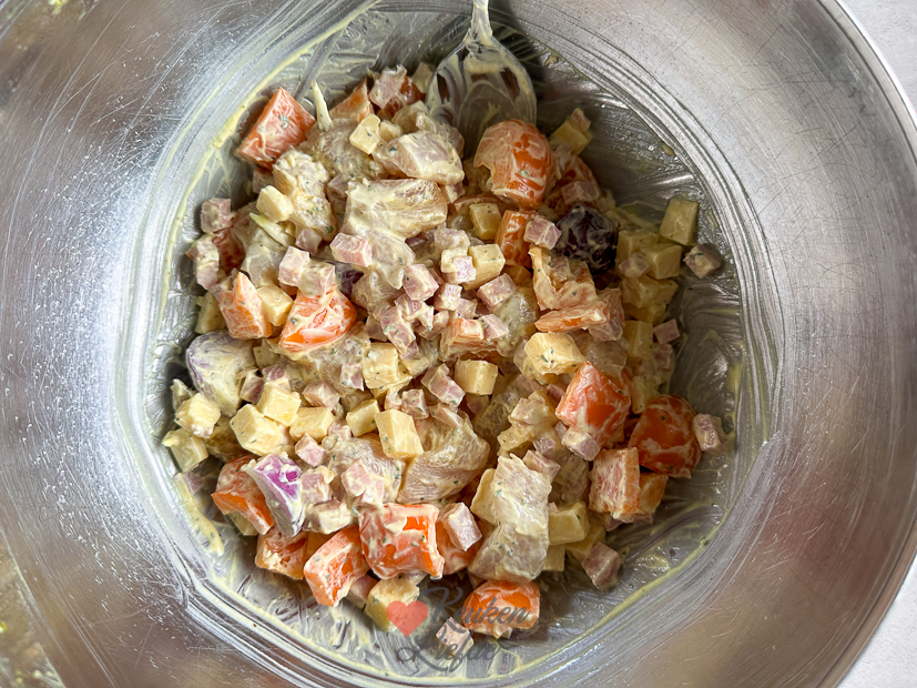 Hussel de kip om met overige peterselie, overige kerrie, overige olijfolie, de hamreepjes, kaasblokjes en de crème fraîche en breng op smaak met zout en peper.