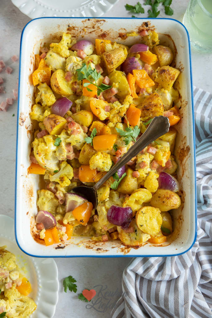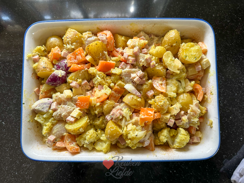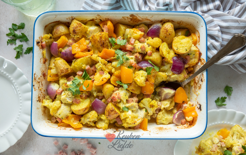 Een heerlijke cordon bleu ovenschotel met verse krieltjes, kipfilet, bloemkool, ham en kaas. Lekker op smaak gebracht met kerrie en romige crème fraîche.