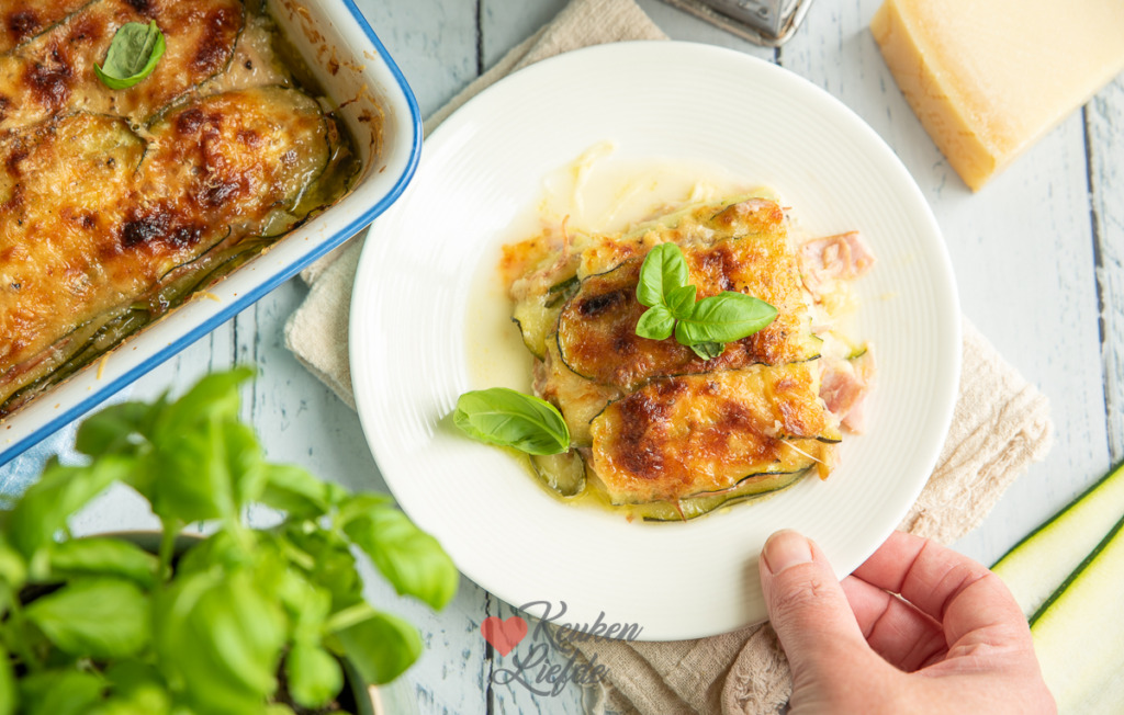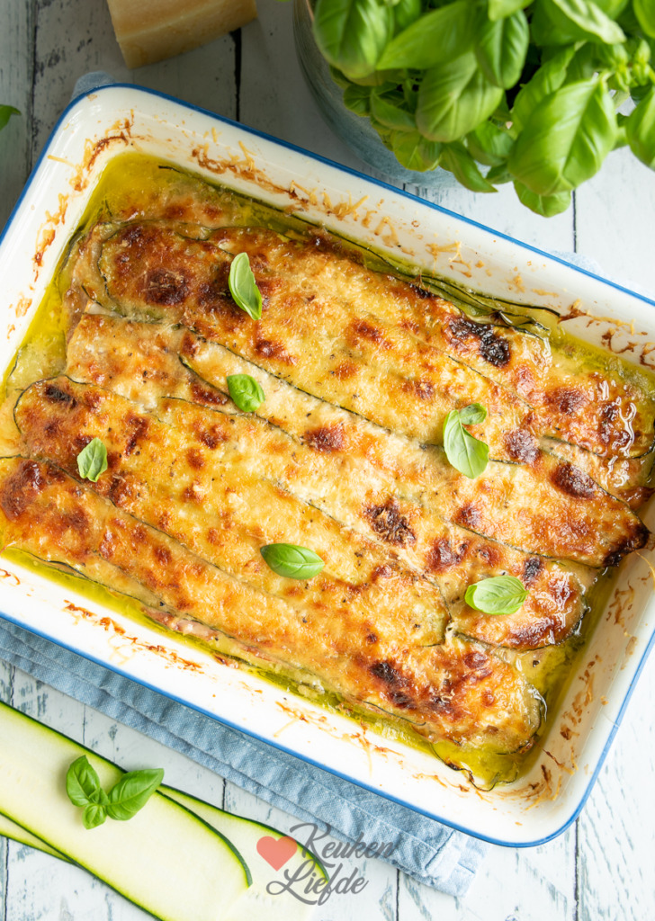 Courgette lasagne met ham en mozzarella. Ik ben dol op lasagne en dit is een leuke variant op de klassieker. Elk jaar hebben wij courgettes uit eigen moestuin en iedereen die een courgetteplantje heeft weet, die dingen groeien als onkruid. Deze lasagne met courgette, ham en mozzarella maak ik graag in de zomer om het overschot aan courgettes in te verwerken. De traditionele lasagnebladen vervang je door dunne courgetteplakken waardoor het tevens een koolhydraatarm recept is. De courgettes gaan rauw de ovenschaal in en garen in de oven. De voorbereiding is zo gepiept. Daarna doet de oven de rest van het werk.