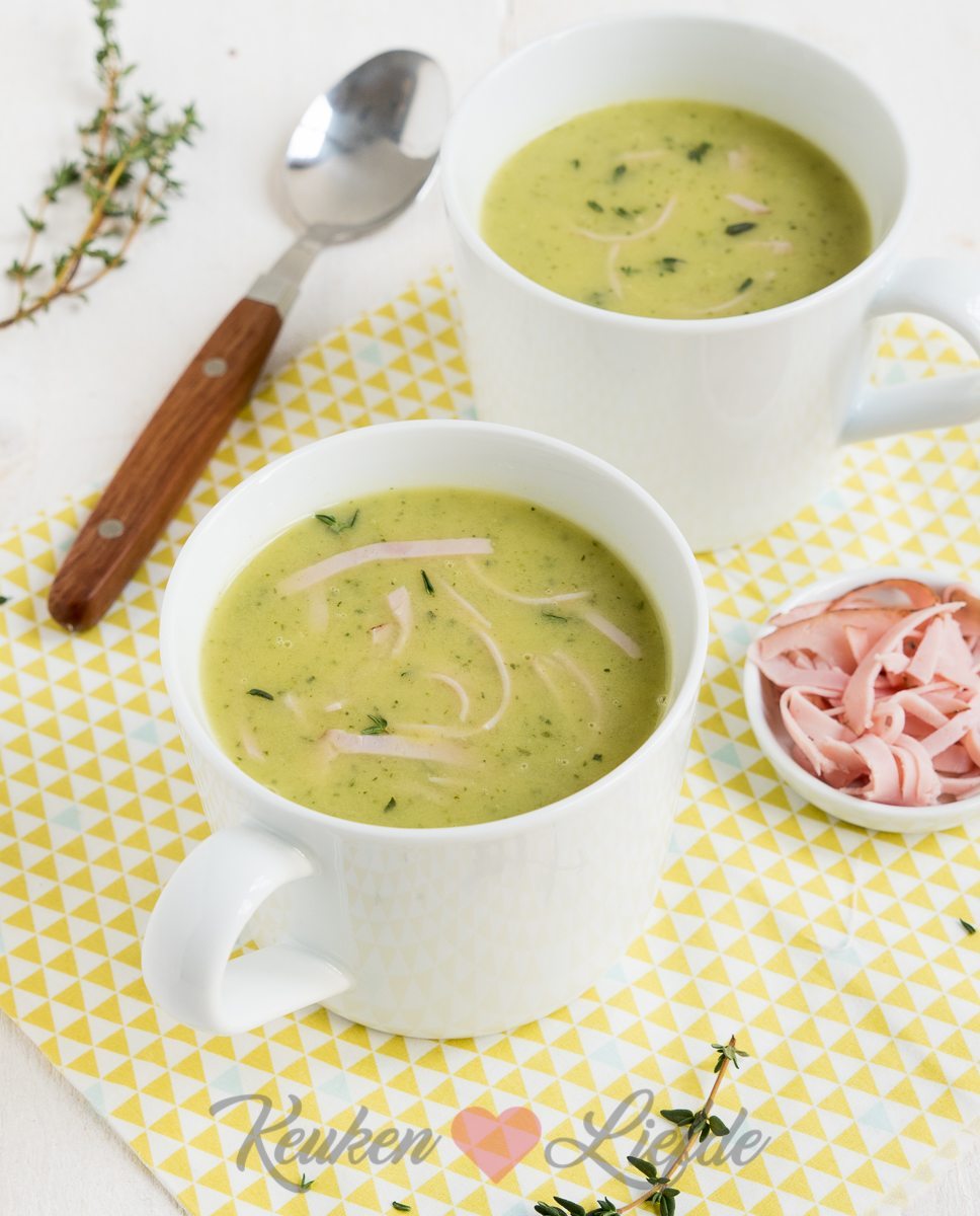 Deze courgettesoep smaakt heerlijk als lunchgerecht, maar je kunt hem ook als voor-, of hoofdgerecht serveren. De toegevoegde aardappel maakt de soep lekker vol en romig van smaak en de hamreepjes maken het af!