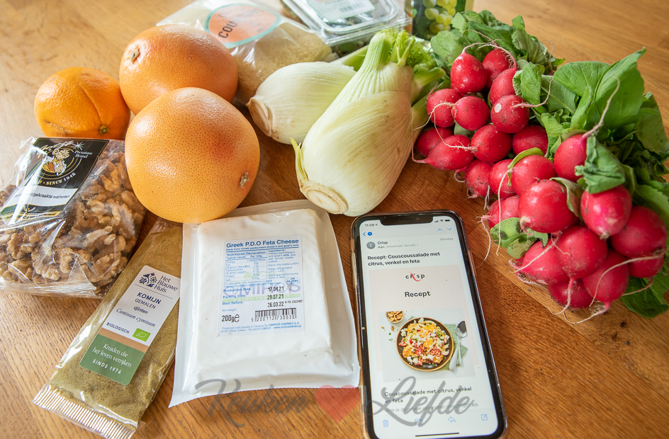 Bij Crisp bestel je je boodschappen via een app op je telefoon. Het was voor ons de eerste keer dat wij bij Crisp bestelden. Ik vond de app heel overzichtelijk en door de filters kun je makkelijk zoeken. Crisp onderscheid zich van andere supermarkten door hun assortiment in delicatessen en verse producten van lokale leveranciers. Het assortiment is heel gevarieerd van groenten, vlees, vis, vega, zuivel, desserts, brood en banket, dranken, kaas tot de lekkerste delicatessen. Ook vind je recepten in de app zoals deze couscoussalade. Zie je een recept dat je aanspreekt dan hoef je enkel het aantal personen in te vullen en het recept toe te voegen aan je winkelmandje. Alle producten worden dan automatisch aan je winkelmandje toegevoegd. Naast de ingrediënten voor dit recept bestelde ik verschillende producten om uit te proberen zoals roombotercroissants, pains au chocolat, zalm, runderriblap, eiersalade, truffelkaas, chocolademousse en vers fruit zoals druiven en pruimen. Stuk voor stuk kwaliteitsproducten en dat zie en proef je! Wil je zelf eens bij Crisp bestellen? Met deze link download je de Crisp-app en activeer je direct 15,- euro korting voor je eerste bestelling!
