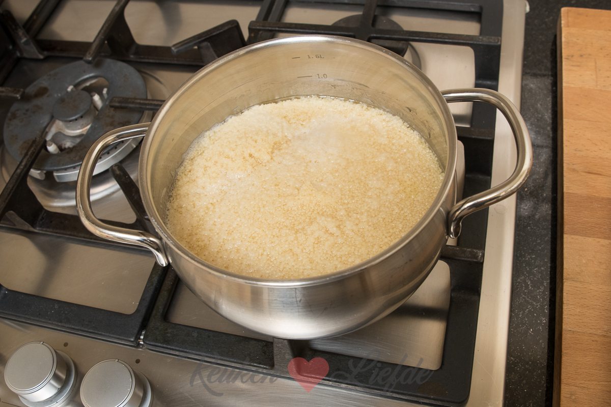 Bereid de couscous volgens de omschrijving op het pak. (In plaats van water kun je de couscous ook wellen in bouillon, dan krijgt de couscous wat meer smaak.)