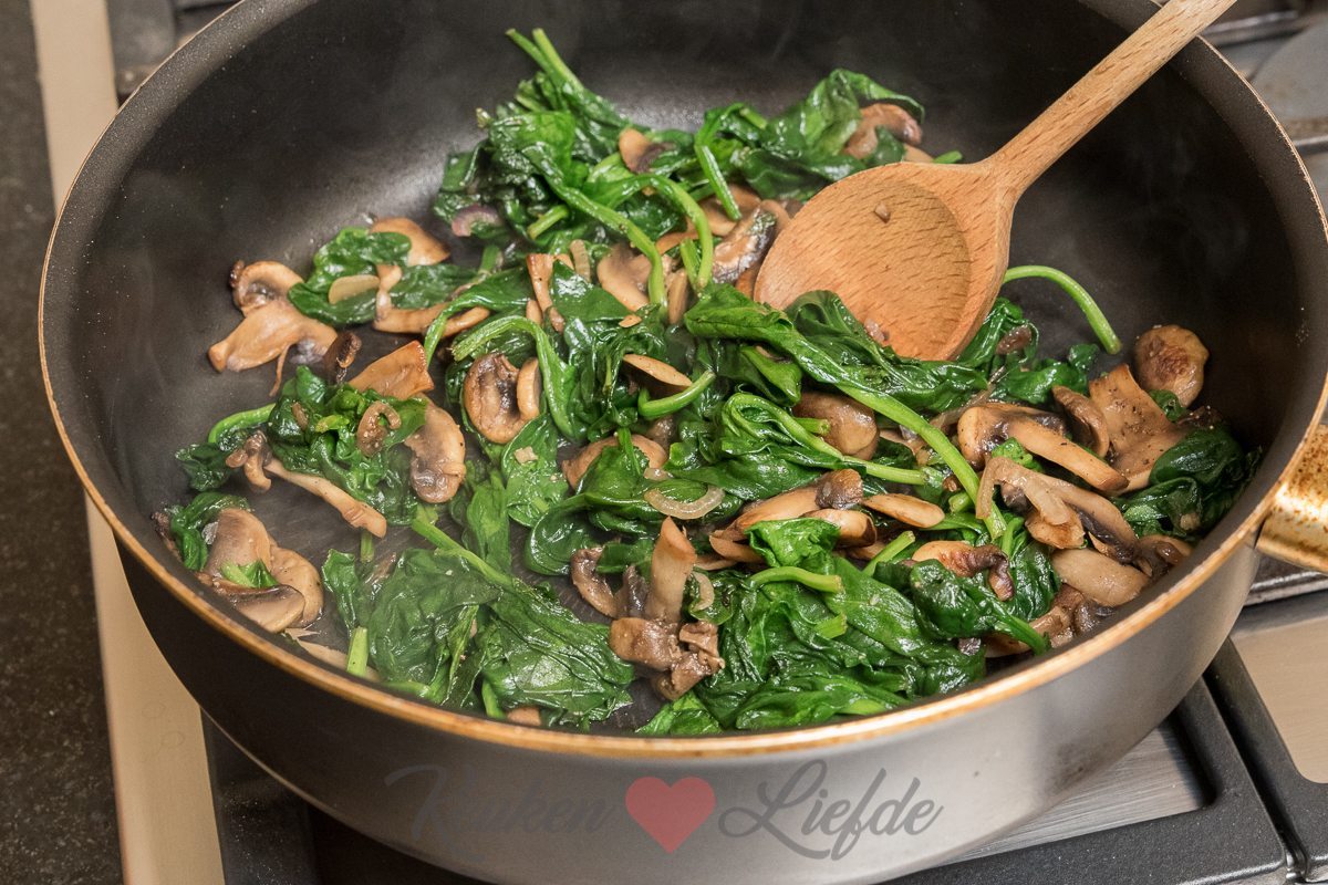 Verhit een grote hapjespan met een scheut olie en bak de ui en champignons op hoog vuur, totdat het vocht uit de champignons verdampt is en de champignons beginnen te kleuren. Voeg beetje bij beetje de spinazie toe en laat slinken. Voeg ook de knoflook toe. Bak op hoog vuur verder totdat al het vocht uit de spinazie verdampt is. Breng op smaak met zout en peper uit de molen.