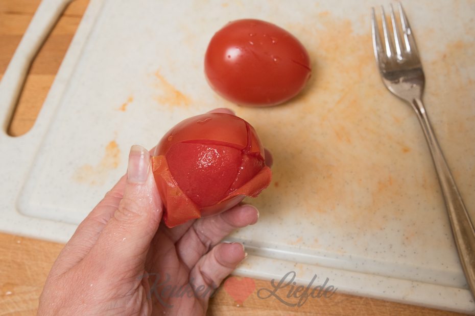 Kruis de tomaten in met een mes en dompel ze enkele seconden onder in kokend water. Trek het vel van de tomaten af en halveer ze. Verwijder het sap en de zaadlijsten en snijd de tomaten in stukken.