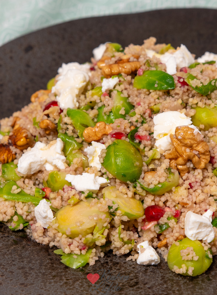 Een heerlijke couscoussalade met spruitjes, granaatappel, walnoot en geitenkaas. Makkelijk om te maken en binnen 20 minuten op tafel.