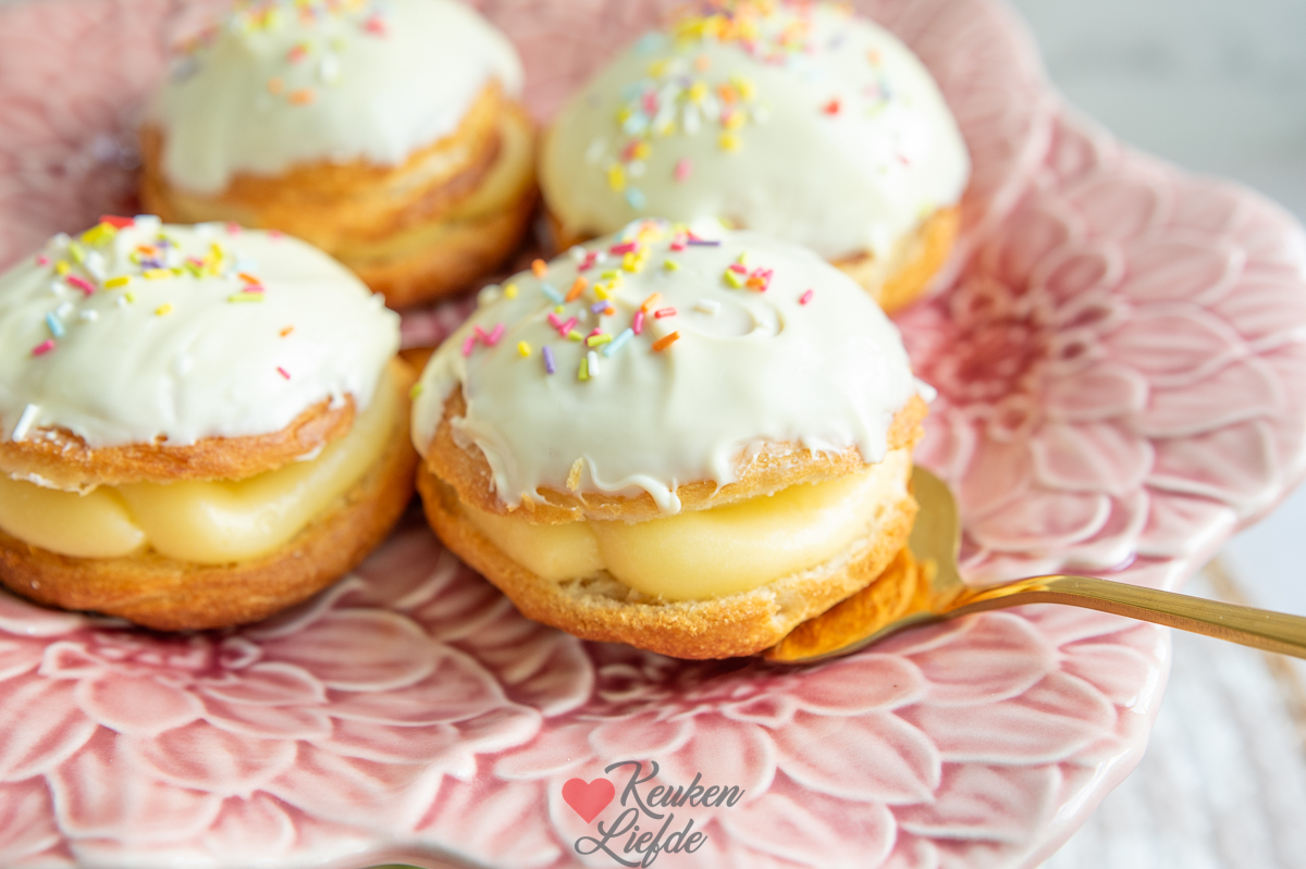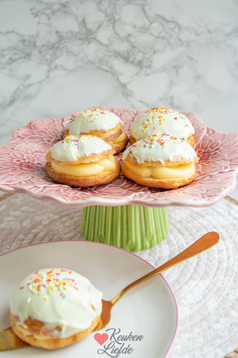 Ik heb gekozen voor een vulling van gele room. Tijdens het maken van de broodjes dacht ik eraan dat het ook lekker zou zijn om bovenop de gele room wat plakjes aardbei te leggen.