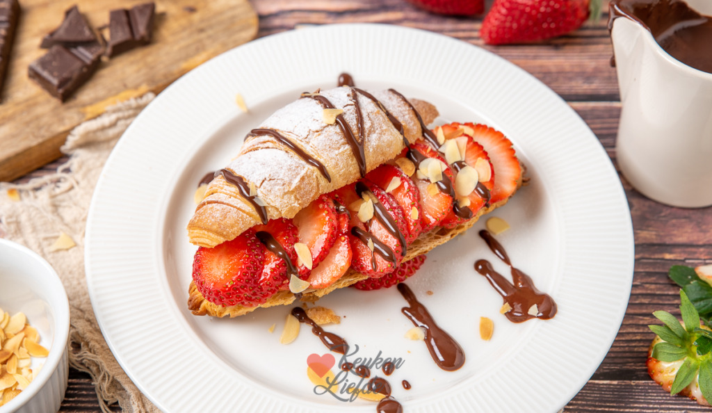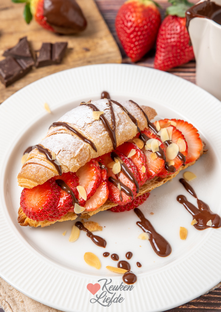 Deze croissant met aardbeien en chocoladesaus is het perfecte valentijnsontbijt om je geliefde mee te verwennen. De chocoladesaus maak je zelf met maar twee ingrediënten. Je hebt voor dit recept niet alle chocoladesaus nodig maar wat je overhoudt kun je bewaren voor een lekker dessert.
