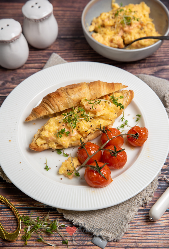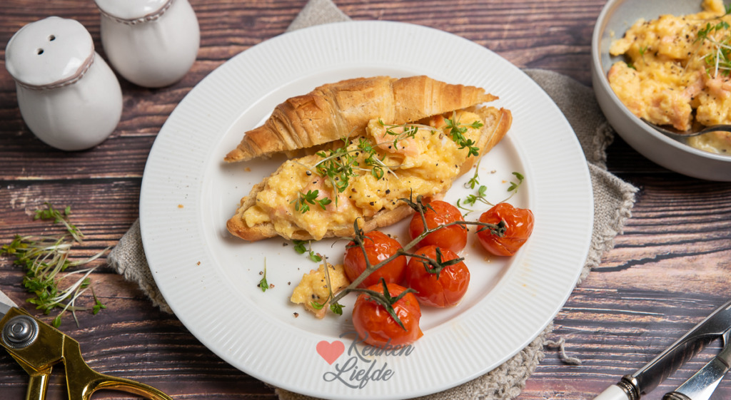 Een heerlijke croissant belegd met smeuïg roerei en gerookte zalm. Wie wordt daar nu niet blij van! De gepofte cherrytomaatjes en tuinkers maken het smulfeest compleet. Lekker als ontbijt, of als lunchgerecht.