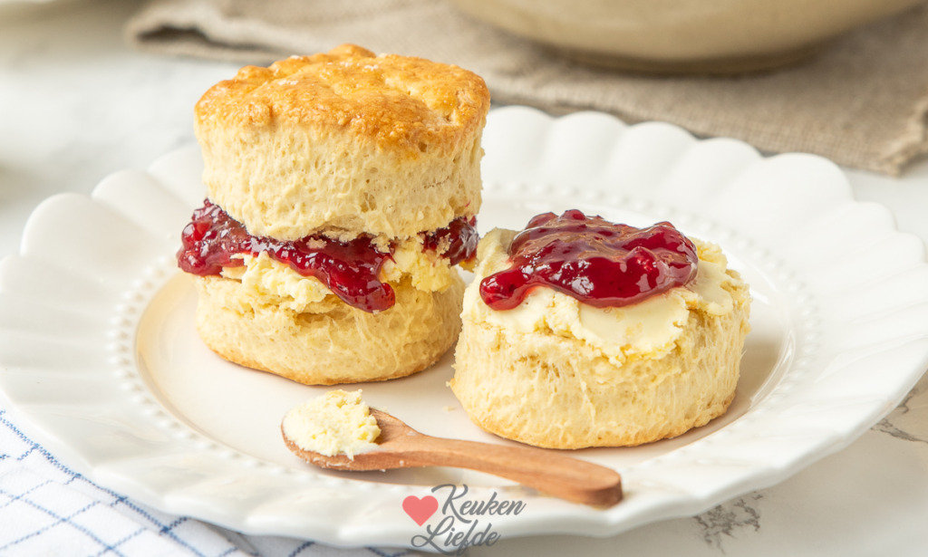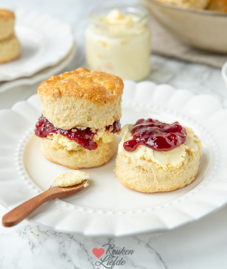 Serveer de scones als ze vers uit de oven komen, dan zijn ze het allerlekkerst. Eenmaal afgekoeld worden ze iets vaster. Scones worden vaak geserveerd met clotted cream en jam. Clotted cream is een dikke room en maak je eenvoudig zelf met dit recept. Ben je niet zo’n zoetekauw? Scones smaken ook heerlijk met een beetje boter en kaas.