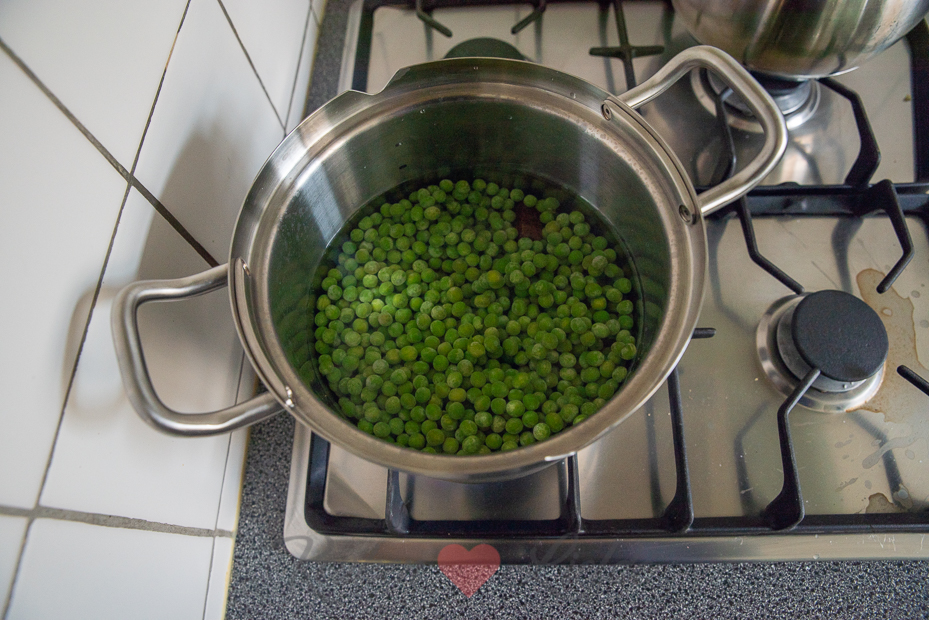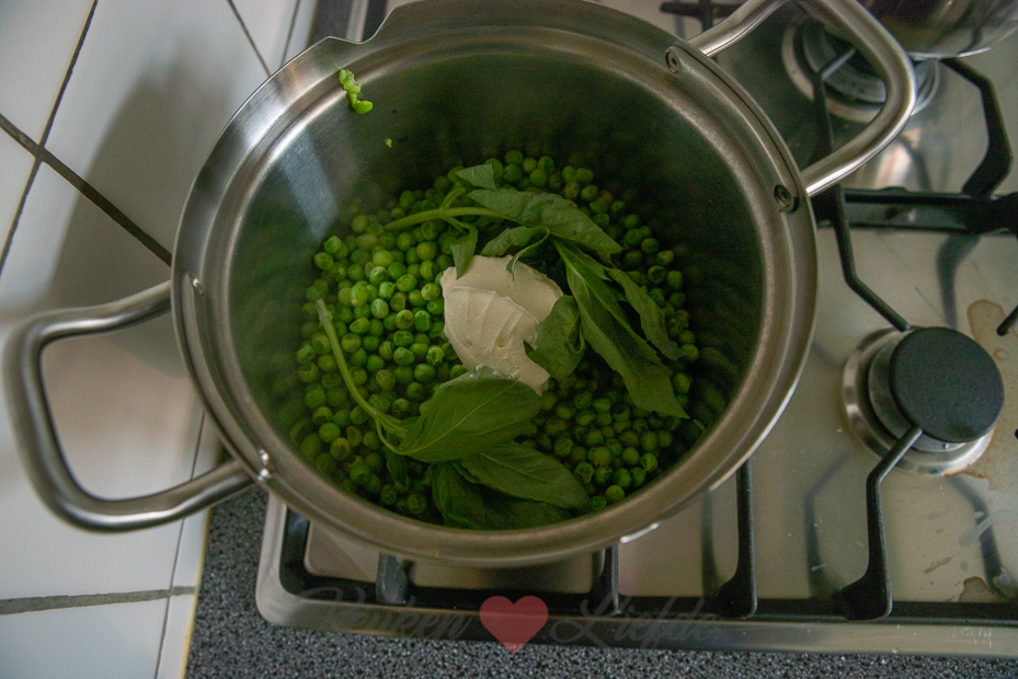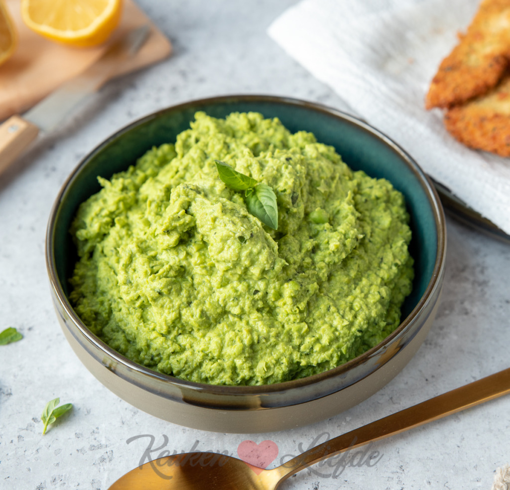 Deze romige doperwtenpuree met crème fraîche en basilicum is een heerlijk bijgerecht om te serveren met gebakken vis, lamsrack, of kip gevuld met pesto en parmaham.