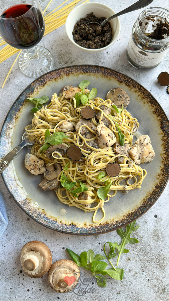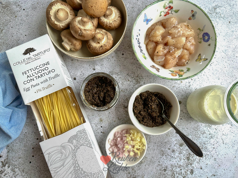 - Ingrediënten voor een lekkere pasta met truffel, kip en champignons.
