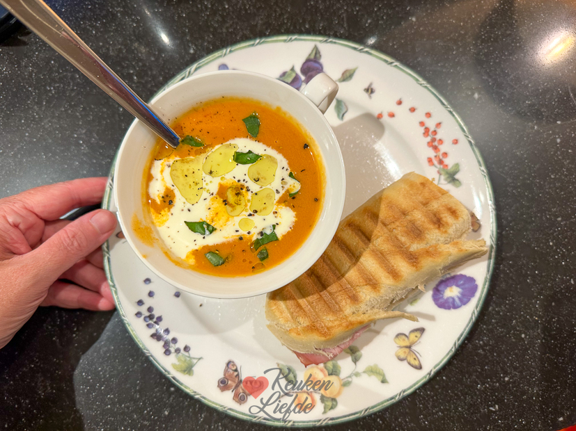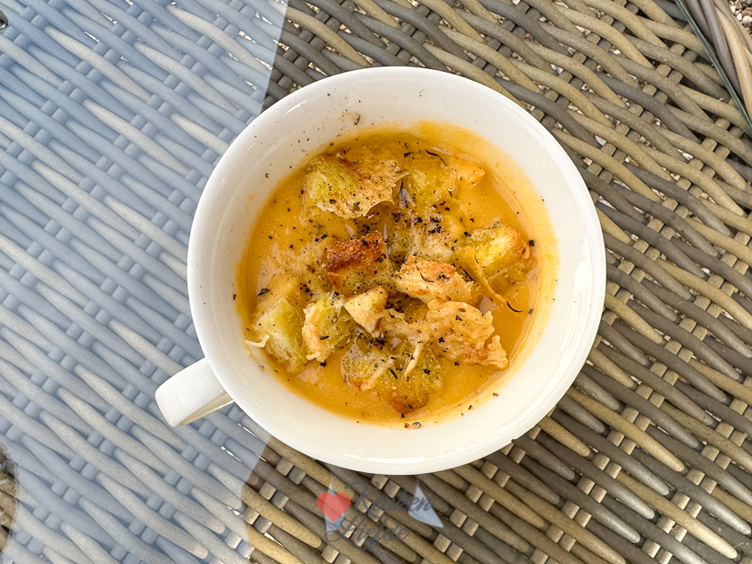 Het weekend zit er weer op, de wekker gaat vroeg. Als iedereen de deur uit is begin ik mijn werkdag op kantoor achter de computer met cappuccino. Ik schrijf onder andere een groot deel van dit Kijkje voor morgen en het artikel voor woensdag maak ik af en plan ik in. Morgen en woensdag heb ik twee kookdagen en dan is het fijn als ik ’s ochtends op tijd kan beginnen. Tussen de middag eet ik een tosti die ik buiten in het zonnetje nuttig. Wat een cadeautje dit mooie weer, daar moeten we nog even van genieten! Eind van dit middag maak ik courgettesoep voor het avondeten. Die krengen in de moestuin blijven maar groeien. Ik serveer de soep met verkruimelde, krokant gebakken bacon en kaascroutons uit de oven.