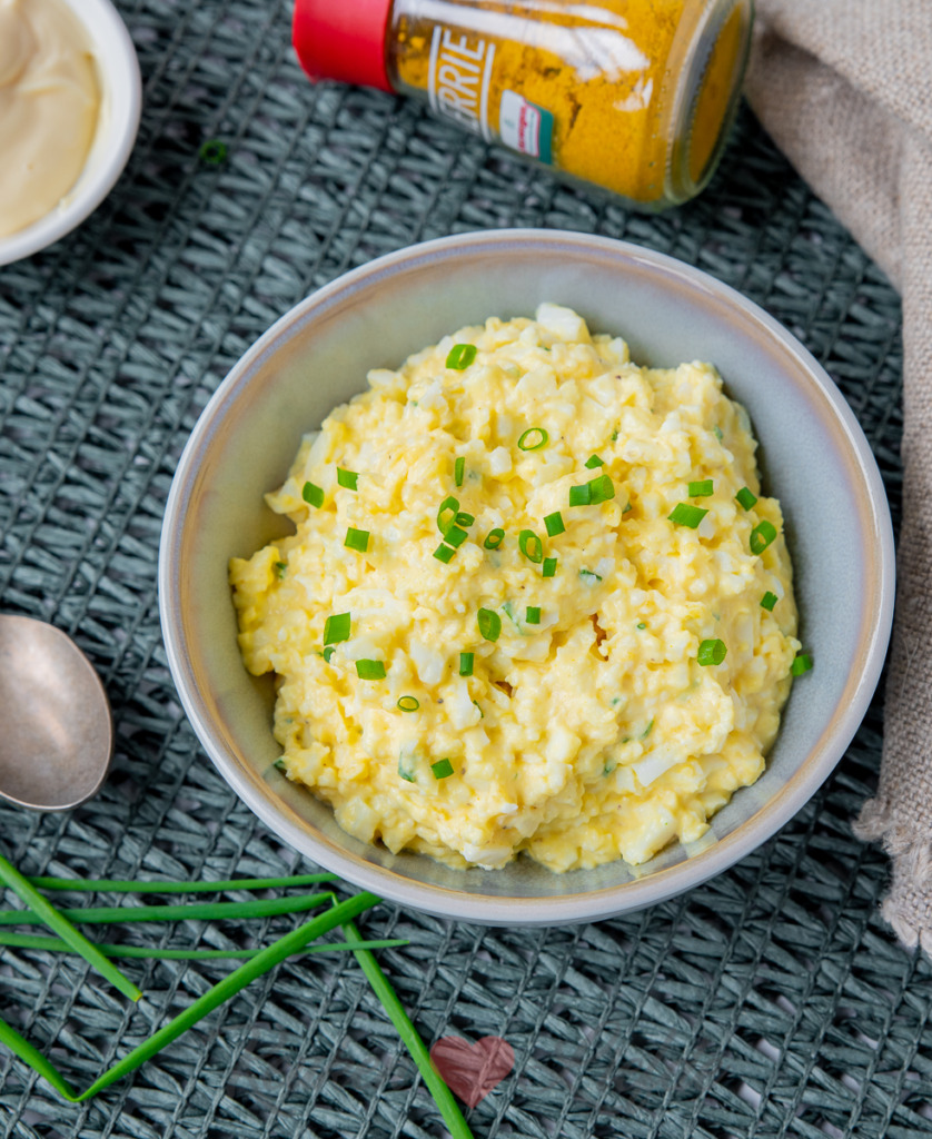 Een eenvoudig basisrecept voor zelfgemaakte eiersalade met een vleugje kerrie en bieslook. Heerlijk bij de borrel op een toastje of stokbroodje, of op een broodje als lunchgerecht.