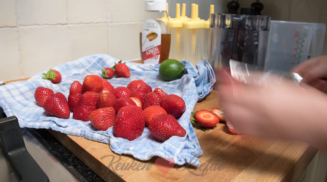 Was de aardbeien en verwijder de kroontjes. Doe de aardbeien in de staafmixer samen met het limoensap en de honing. Mix glad.