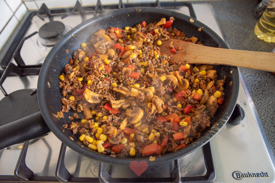 Verhit de koekenpan met een scheutje zonnebloemolie en voeg de uien, suiker en wat zout toe. Bak op laag vuur tot de uien zacht zijn en beginnen te kleuren. Door de suiker gaan de uien een beetje karameliseren, wat heel lekker is! Voeg de paprika-, komijn- en gemberpoeder, oregano en het gehakt toe en bak op middelhoog vuur rul. Voeg de paprika, champignons en mais toe en bak 5 minuten mee. Breng op smaak met zout en peper. Voeg tomaten frito toe (een paar eetlepels, genoeg om het gehaktmengsel lekker smeuïg te maken), 1 flinke eetlepel harissa en de peterselie (houd wat achter voor garnering) toe. Laat de saus 2 minuten zachtjes pruttelen.