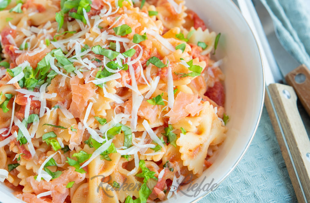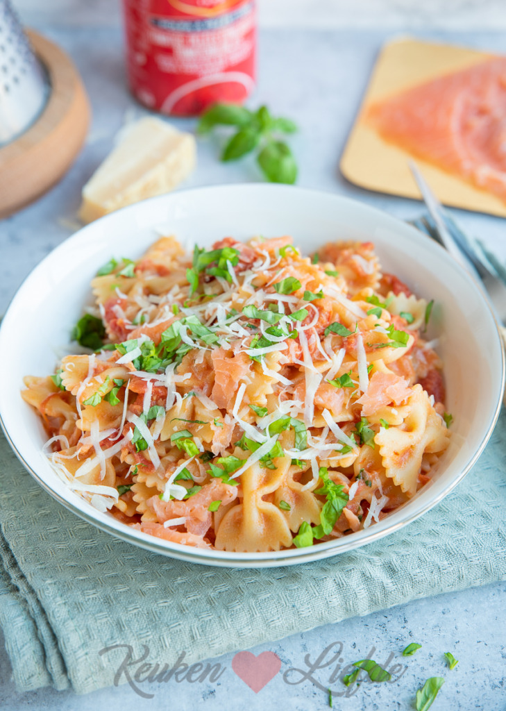 Deze farfalle met tomatenroomsaus en zalm maakte ik een tijdje geleden als avondeten en toen hij voorbijkwam in het wekelijkse Kijkje in de keuken vroegen veel lezers naar het recept. Maar natuurlijk. Het is een heerlijk recept en bovendien heel makkelijk om te maken. Ik heb in dit recept gekozen voor farfalle pasta omdat ik die er leuk uit vind zien, maar je kunt ook andere pasta naar keuze gebruiken. Zie ook onderstaande variatietips!