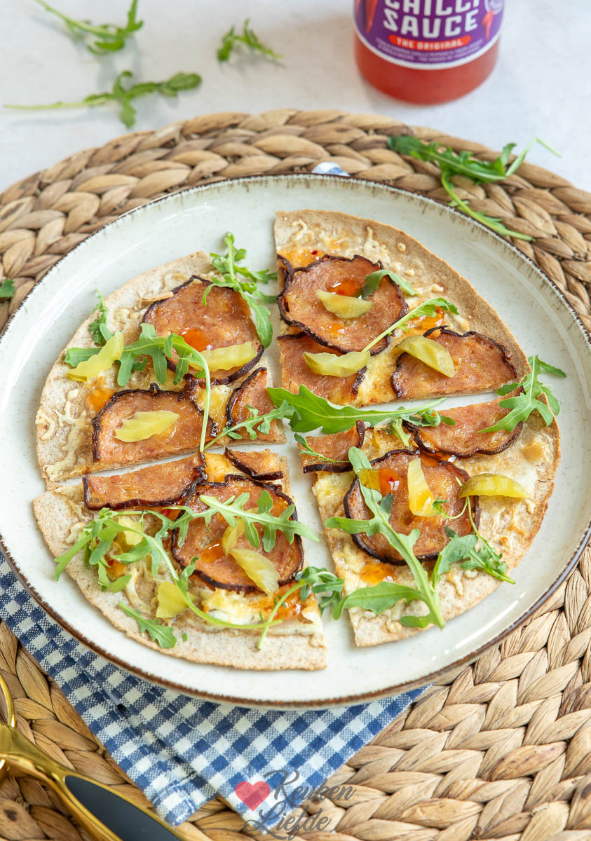 Flammkuchen wrap met grillworst, chilisaus en augurk – makkelijk, snel en boordevol smaak!