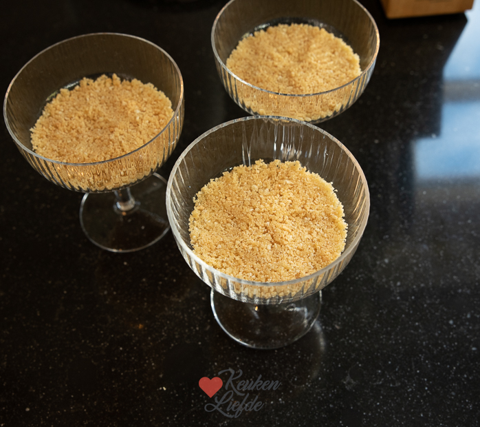 Maal 12 lange vingers fijn in een hakmolen. Smelt de roomboter en roer door de lange vingers. Verdeel het koekkruim over 6 glaasjes en druk een beetje aan met de bolle kant van een lepel.