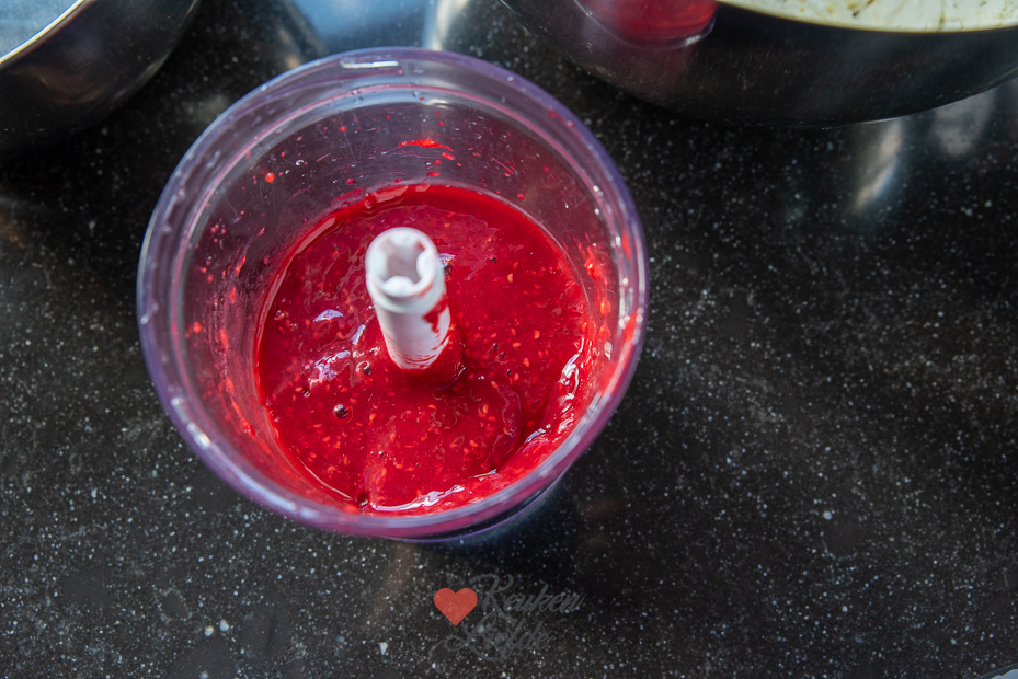 Verhit de bevroren frambozen kort in een steelpannetje op hoog vuur tot ze half of bijna ontdooid zijn. Pureer ze tot puree met een staafmixer of in een hakmolen. Laat de frambozenpuree afkoelen.