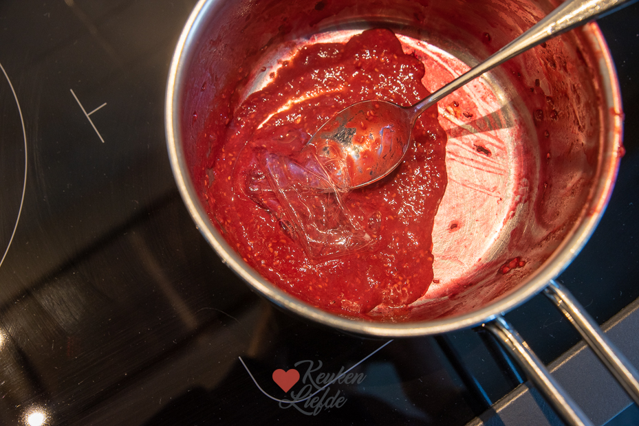 Schep de frambozenmousse over de koekbodem in de glaasjes. Beweeg de glaasjes een beetje om de mousse te verdelen.