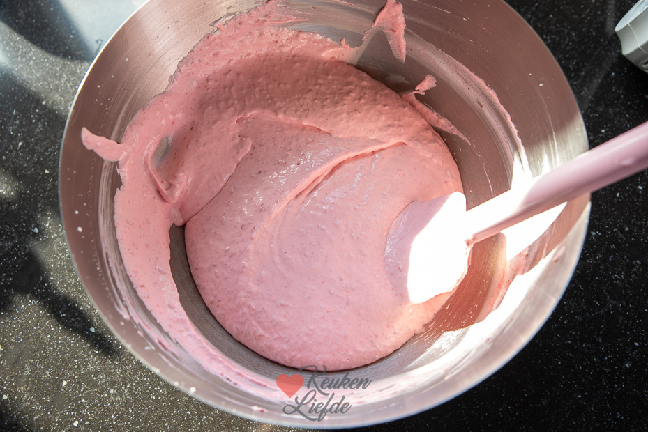 Doe de Griekse yoghurt, frambozenpuree (met en zonder gelatine) bij de slagroom en klop kort verder tot een glad mengsel.