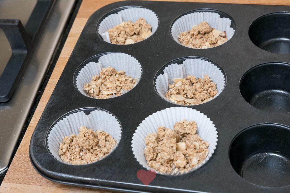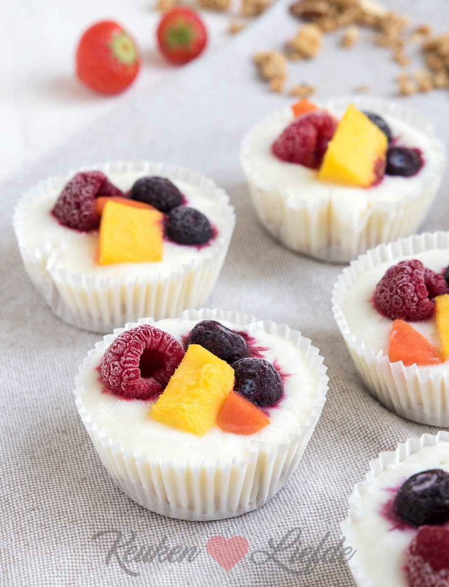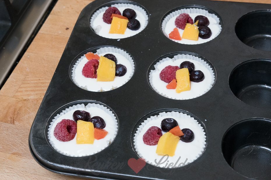 Vul 6 holtes van het bakblik met de papieren cupcakevormpjes. Vul elk vormpje met een eetlepel cruesli. Roer de honing door de yoghurt en schenk dit voorzichtig over de cruesli. Garneer met vers fruit.
