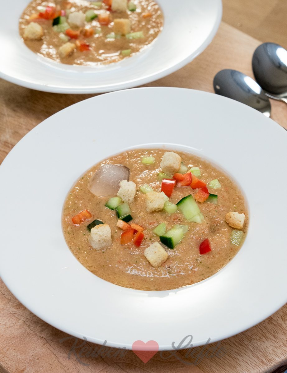 Nooit gedacht dat ik koude soep zo lekker zou vinden, maar deze gazpacho is natuurlijk niet voor niks een Spaanse klassieker. Gazpacho is een dikke soep die koud geserveerd wordt. Hij wordt gemaakt van rauwe tomaat, komkommer, ui, paprika en brood die samen in de blender tot een gladde soep gepureerd worden. Supermakkelijk om te maken dus! 🙂