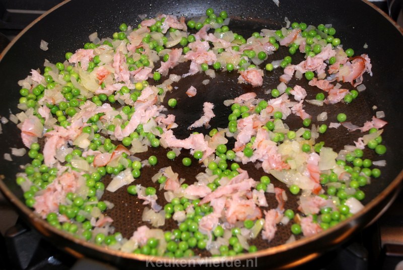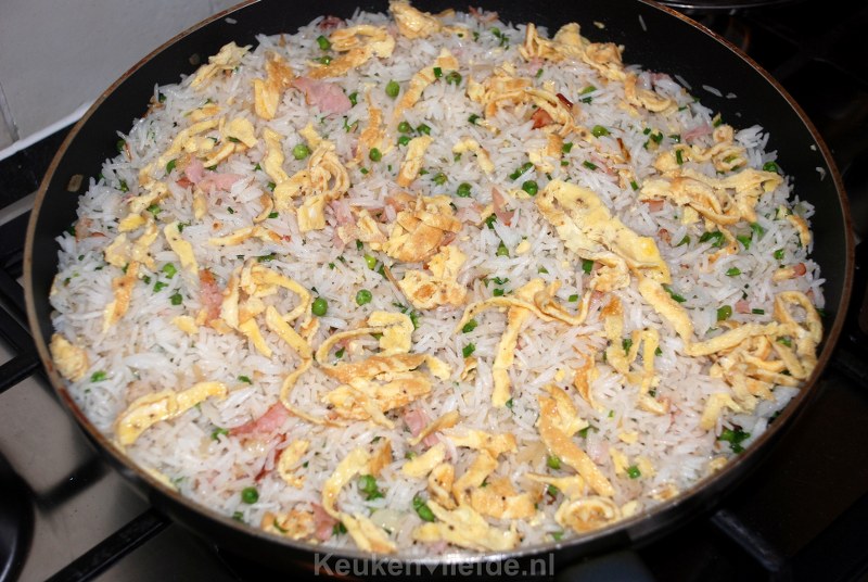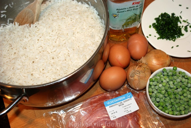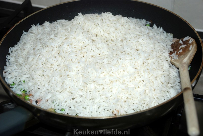 Het geheim van dit recept is om reeds eerder gekookte en koude rijst van een dag ervoor te gebruiken. Het gerecht is dan niet alleen veel sneller klaar maar ook kun je de rijst dan veel beter opbakken. Gebruik het liefst een rijstsoort die wat droger blijft na het koken zoals bijvoorbeeld basmati.