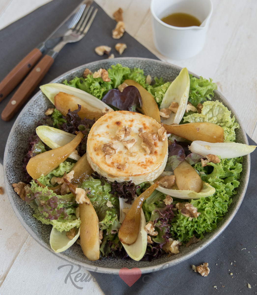 Zodra het buiten weer kouder wordt en de blaadjes van de bomen vallen is dit een van mijn favoriete herfstsalades: een geitenkaas salade met gebakken peer, fris-bittere witlof en knapperige walnoot. Het is een heerlijk lunchgerecht, maar met wat geroosterd brood erbij kun je hem ook prima als hoofdgerecht serveren.