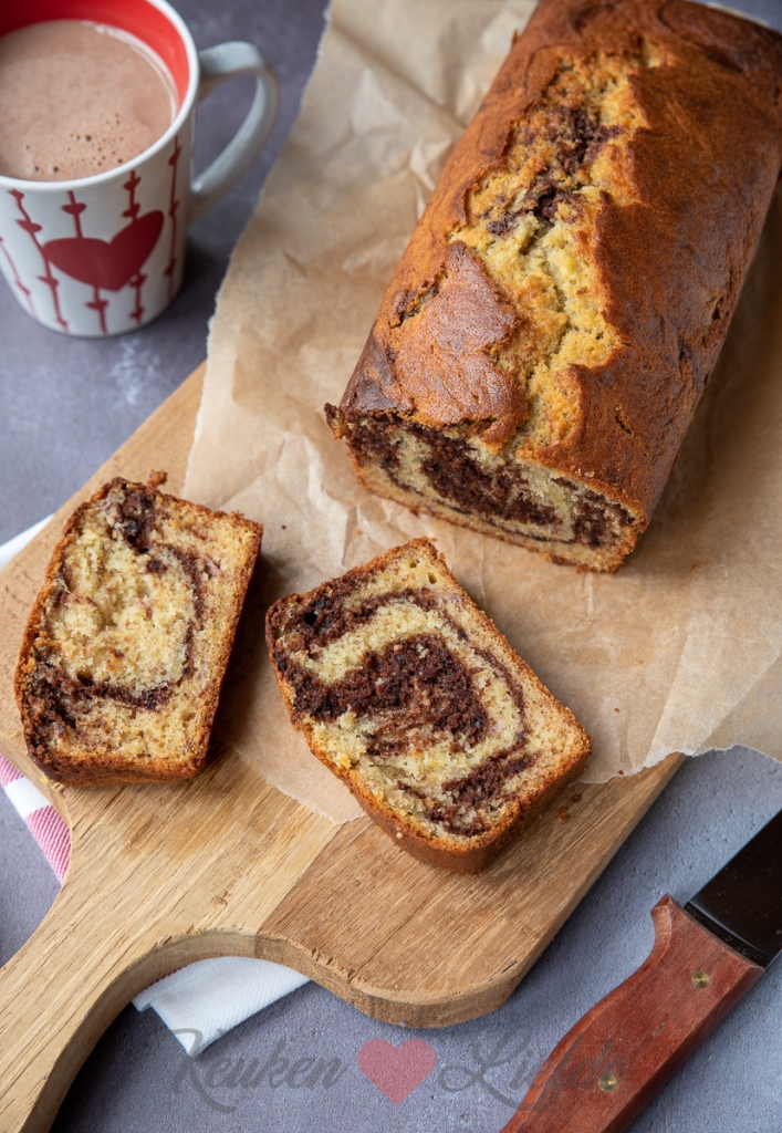 Gemarmerd bananenbrood – Terwijl ik met Nacho tijdens puppytraining stond te verregenen op een modderig grasveld, maakte Johan thuis dit bananenbrood. Wat is hij goed gelukt! Dit sappige bananenbrood is gemarmerd met cacaopoeder en krijgt zo een subtiele chocoladesmaak. Simpelweg verrukkelijk!