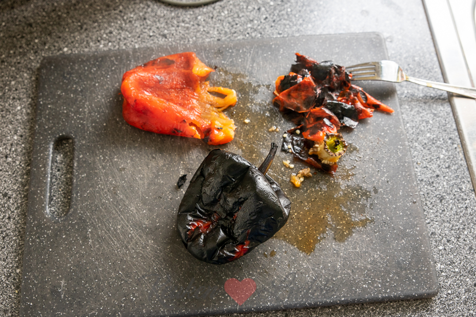 Door de paprika te roosteren krijgt hij een licht gerookte en zoete smaak die perfect past bij de zalm, avocado en geitenkaas.
