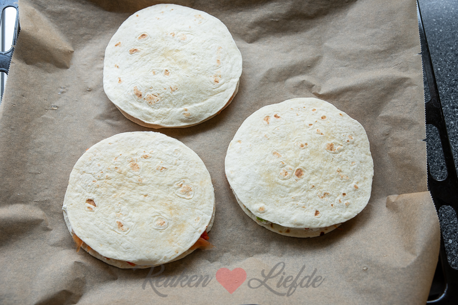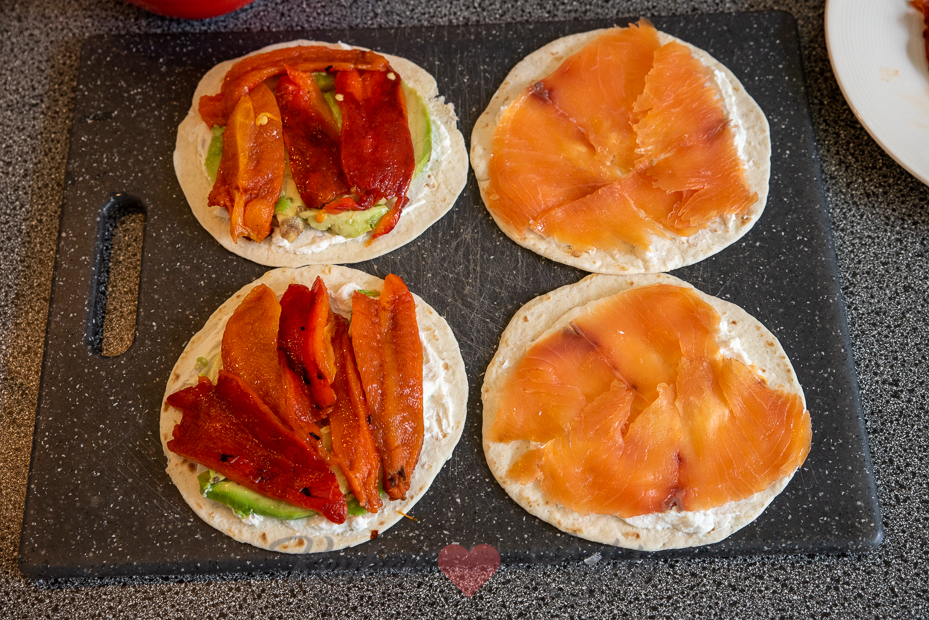 Smeer de geitenkaas over de zes tortillawrap. Beleg drie wraps met zalm en de andere drie met avocado en paprika (en eventueel mango als je wilt). Leg de wraps bovenop elkaar en grill ze op de barbecue, in een hete grillpan, of onder een hete ovengrill circa 8 minuten tot ze goudbruin zijn. Draai ze halverwege de baktijd om.